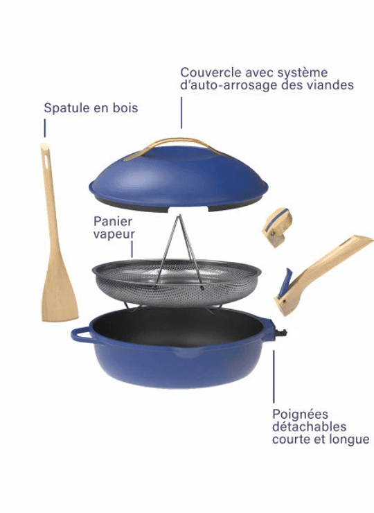 Spiegeleieren, gegrilde kip, gestoomde groenten, stoofgerechten, friet, ovenschotels, taarten, pizza…Inclusief: 2 afneembare handgrepen (één lange en één korte), een stoommandje en een houten spatel.Met deze pan is alles mogelijk!