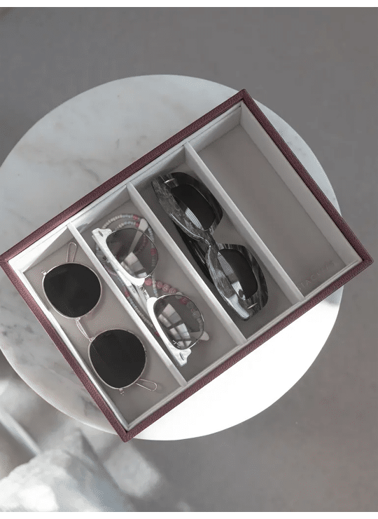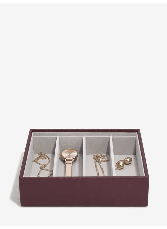 De Glazen & Accessoires Laag is een diepere laag, ontworpen om brillen of zonnebrillen en grote accessoires binnen de 4 secties op te bergen. Met afneembare scheidingsdelen om flexibel te zijn en de grootte van je secties aan te passen. Voeg deze laag toe aan je Stackers-sieradendoosje of gebruik deze als losse opslagruimte op een ladekast of in een lade.Gevoerd met een luxueuze fluwelen binnenkant die sieraden veilig beschermt. Met een nep-leer bordeauxrode buitenkant.