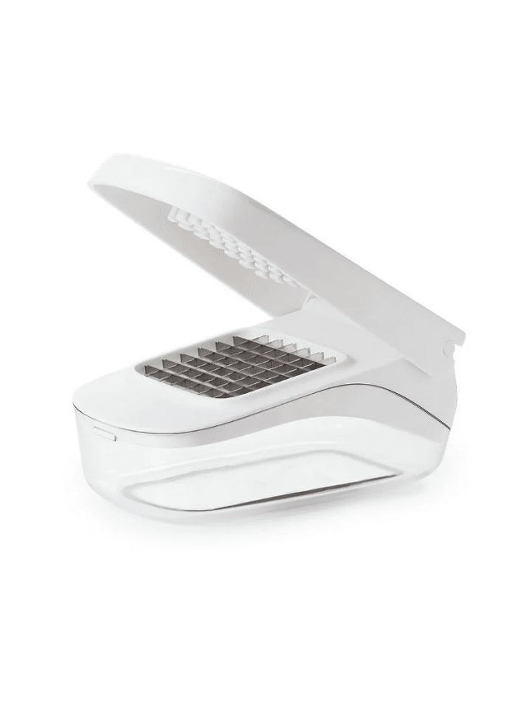 Geen tranen meer! Snijd snel en veilig uien, paprika's en meer in één eenvoudige beweging, en giet gemakkelijk gehakt fruit of groenten zonder het deksel te verwijderen. Het roestvrijstalen mespatroon en het verzonken snijgebied houden voedsel op zijn plaats, terwijl het deksel hefboom biedt voor efficiënt snijden.