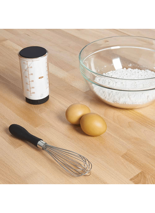 Je zet de smalle ballongarde in het te kloppen recept en je maakt met je pols een draaiende, slaande beweging. Hij is perfect voor kleine gerechten in een kleine kom. Zoals het loskloppen van een ei.