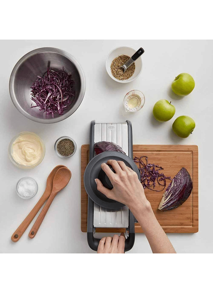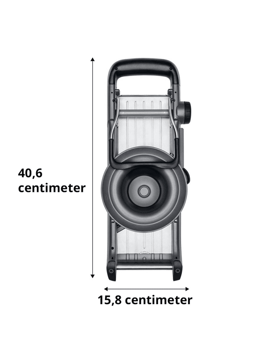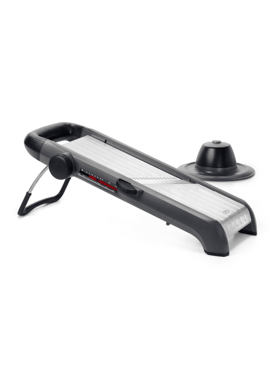 Je pak de mandoline en klikt de restenhouder er vanaf. Vervolgens klap je het pootje uit en zet je hem dankzij de anti-slipvoetjes stevig op het aanrecht. Je stelt de juiste dikte en de juiste stand in. Vervolgens duw je met de restenhouder de ingrediënten over het mes.