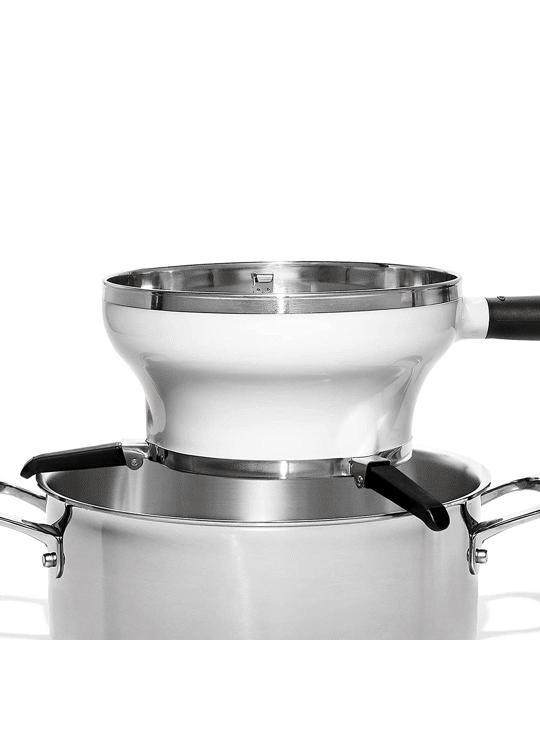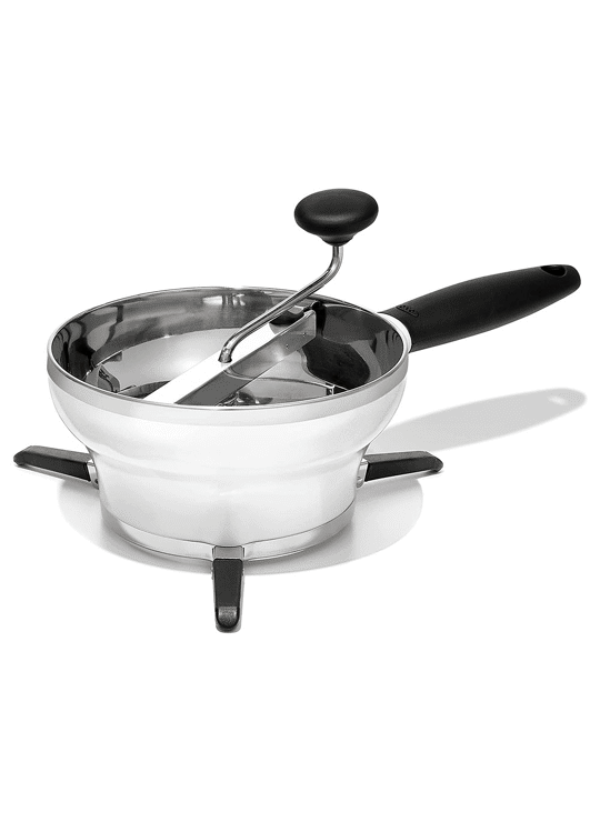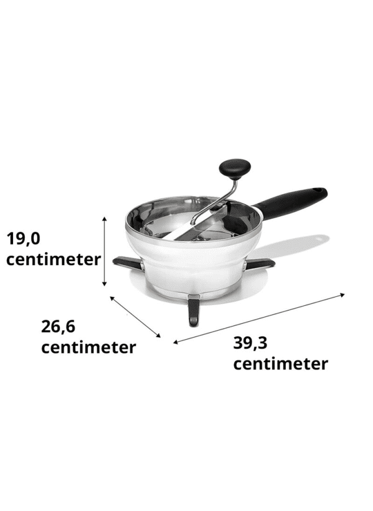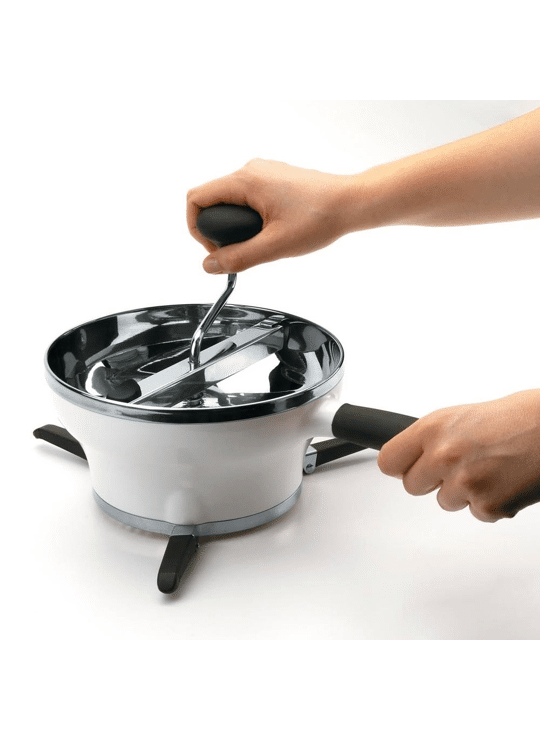 Je neemt de OXO Passeerzeef uit de kast. Je klapt de pootjes uit en zet hem op een pan of een schaal. Hier blijft hij dankzij anti-slip stevig op staan. Je kiest de juiste zeef en klikt hem erin. Vervolgens vul je de zeef met de te zeven producten. En draai je soepel aan de slinger. Gemakkelijk zeef je zo alles perfect glad.