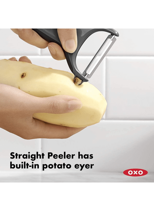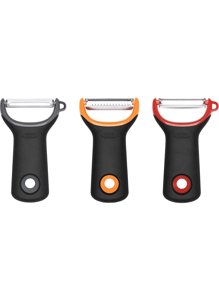 De OXO Good Grips 3-delige geassorteerde dunschiller-set bevat rechte, gekartelde en julienne dunschillers.