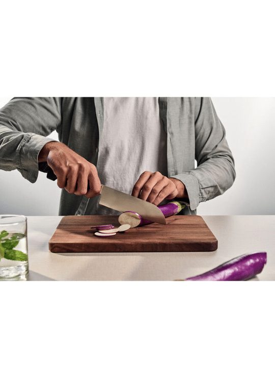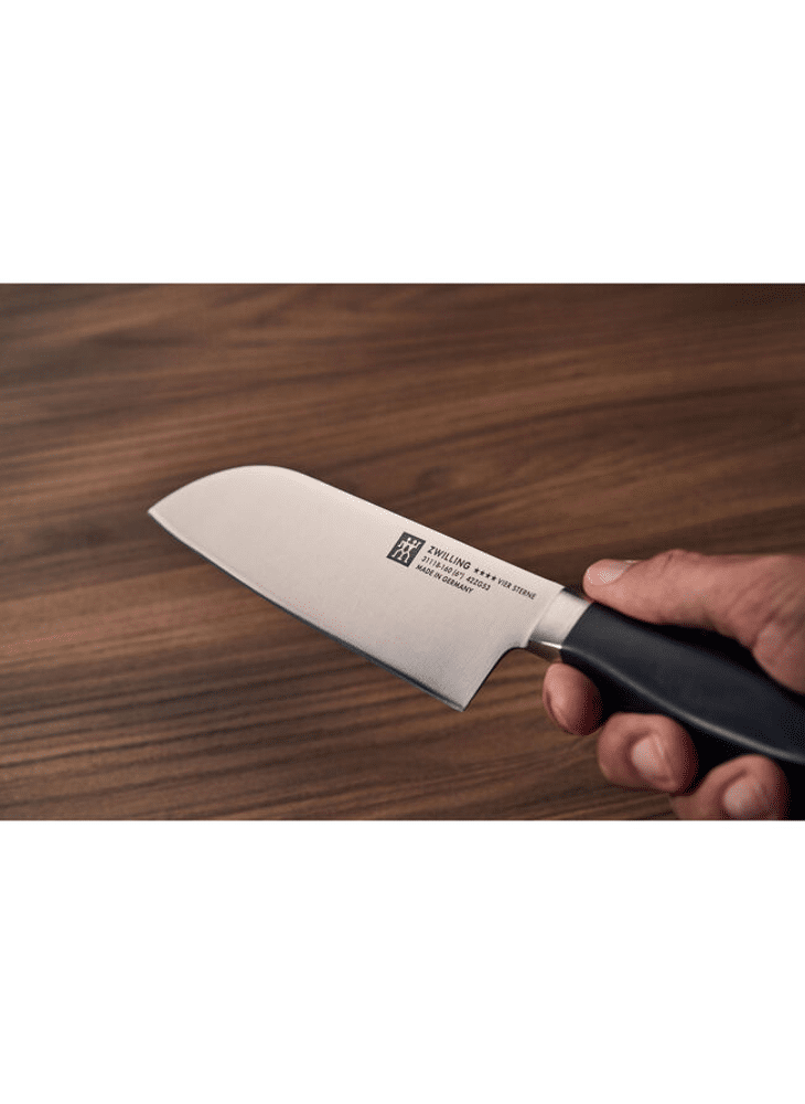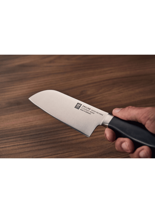 Het santokumes is een Japanse allrounder. Het combineert de traditionele Japanse kenmerken voor het versnijden van vis en groenten met de moderne, westerse eigenschappen van een vleesmes. Daarom kunt u met het 16 cm lange lemmet zo goed als alle voedingswaren versnijden, zelfs grotere ingrediënten. Wilt u een Japanse maaltijd op tafel toveren? Dan is dit het perfecte mes voor uw 'mise en place'. Uiteraard zijn ook Europese gerechten met vis, vlees en groenten geen probleem voor dit mes. Het Four Star santokumes staat garant voor uitmuntende kwaliteit. Het werd vervaardigd uit één stuk staal, van het lemmet tot aan de greep. Dankzij een speciale legering en een al even bijzonder afwerkingsproces is dit mes extreem robuust en gaat het jarenlang mee. Bovendien werd het materiaal zo geslepen dat het lemmet de perfecte snijrand kreeg. Het mes blijft dan ook dag in, dag uit vlijmscherp. De ergonomische greep ligt dan weer comfortabel in de hand. Met dit santokumes van ZWILLING geeft u uw keuken meteen een Aziatische toets.